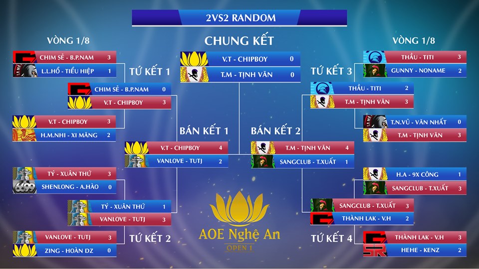 - Ngày hôm qua (31/08), giải đấu AoE Nghệ An Open I chính thức kết thúc, khép lại chuỗi hành trình đầy cảm xúc trong đấu trường 2v2 Random và 4v4 Random. Trong đó, chúc mừng GameTV với chức Vô địch 4v4 Random và Truy Mệnh, Tịnh Văn của clan Thái Bình trở thành Nhà Vô địch 2v2 Random.
