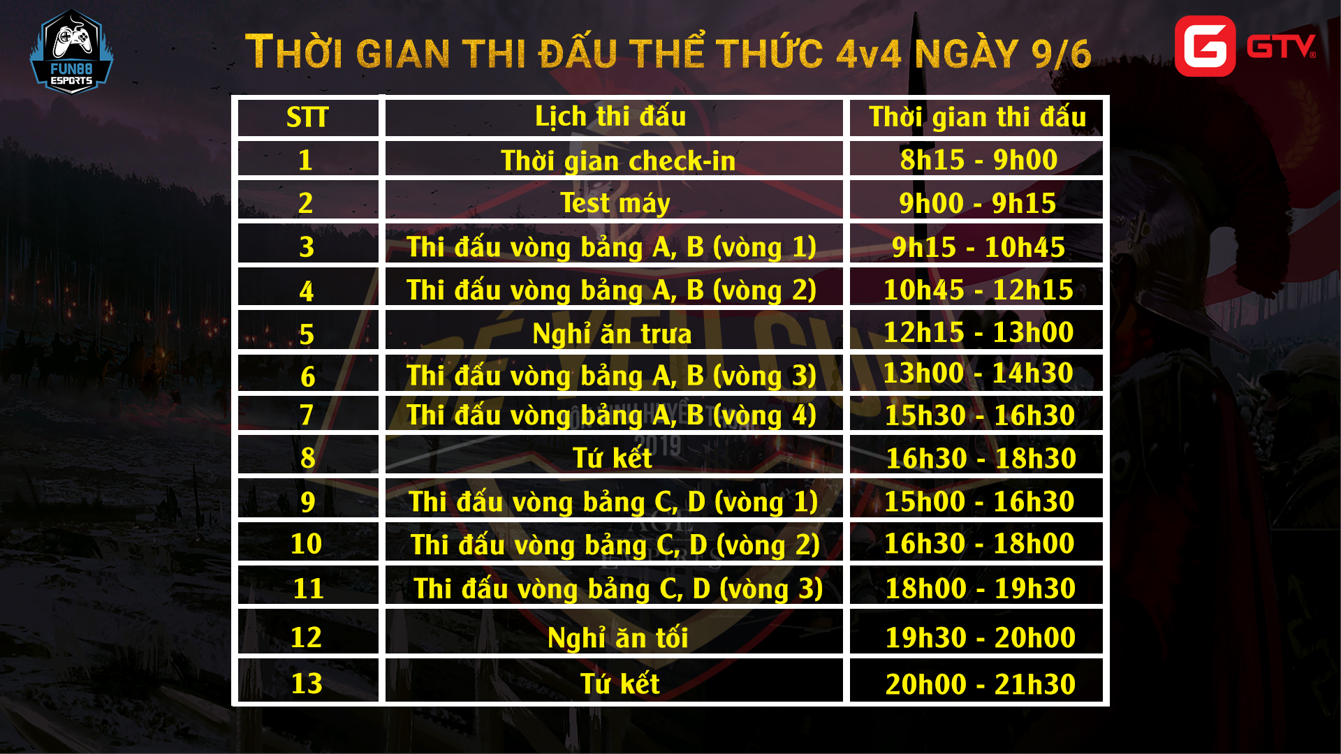 Theo đó, lịch thi đấu các nội dung 1v1, 2v2 và 4v4 cụ thể như sau: