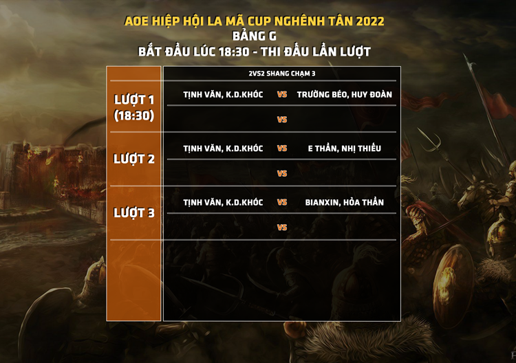 Hôm qua, thể thức 2vs2 Shang thuần tiễn của giải đấu AoE Hiệp hội La Mã Cup Nghênh Tân đã chính thức khởi tranh với những diễn biến đầu tiên của bảng D. Hôm nay, giải đấu sẽ tiếp tục với các trận đấu thuộc khuôn khổ bảng G.