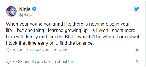 Dù thành công vượt bậc, thế nhưng Ninja vẫn là con người. Mới đây, vào ngày 28 tháng 6, anh đã chia sẻ trên Twitter về điều mình nuối tiếc nhất trong quãng thời gian vừa qua