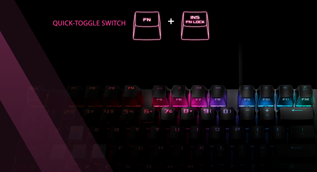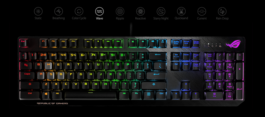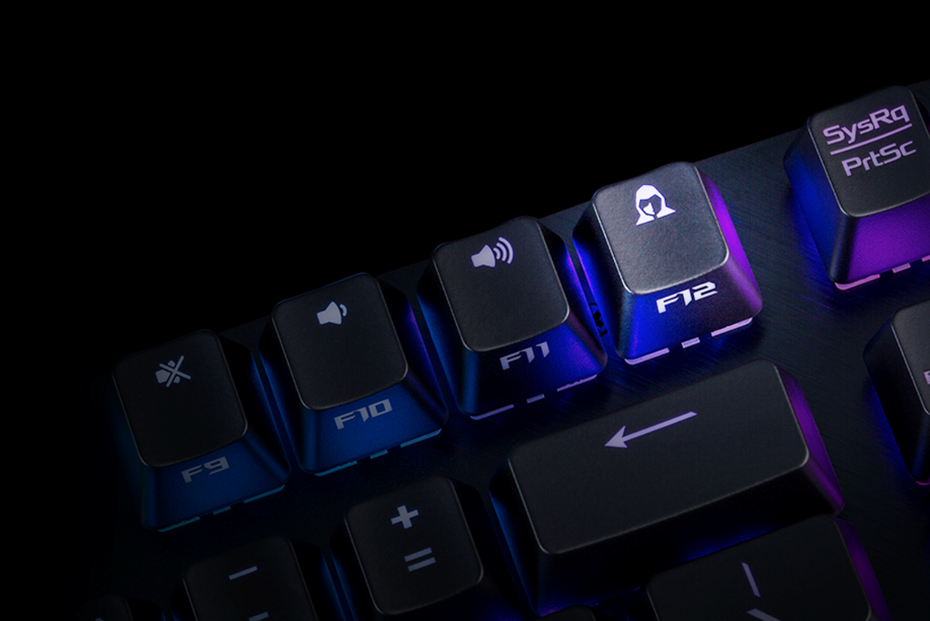 Các mũ phím đều được thiết kế để tận dụng tối đa sức mạnh của hệ thống đèn nền ASUS Aura RGB trên Strix Scope, tạo ra độ sáng đều trên toàn mũ phím kể cả trên phần các chức năng phụ của phím. Các phím từ F5-F12 được chiếu sáng phía trước dành cho các tác vụ điều khiển media. Người dùng có thể chuyển đổi dễ dàng giữa hai hệ thống này.