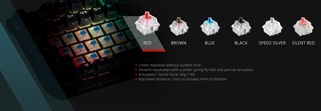 Strix Scope được trang bị các switch Cherry MX RGB với độ chính xác cơ khí cao, đem lại cảm giác chính xác cho các game thủ và người sử dụng khác. Các switch chất lượng cao được sản xuất ở Đức và được kiểm nghiệm chi tiết độ phản hồi trên từng phím bấm. Hiện bàn phím đã có đầy đủ các mẫu phím như Cherry MX Red, Brown, Blue, Black, Silent Red và Speed Silver , cho phép game thủ tự do lựa chọn loại switch phù hợp theo phong cách của mình.