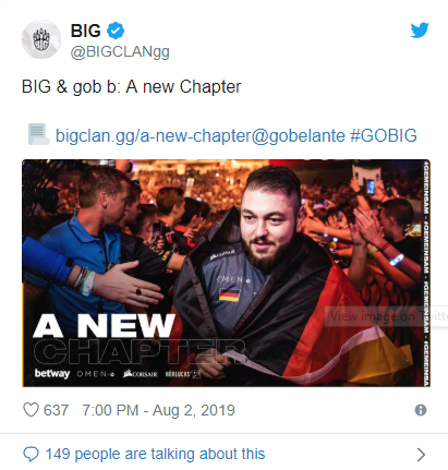 Với việc gob b rời khỏi đội hình chính thức, BIG giờ chỉ còn thi đấu với 4 người trong đội hình chính. Trong thông báo mới nhất của mình, tổ chức này tiết lộ rằng họ sẽ quyết định tái cấu trúc đội hình của mình và sẽ có thông báo sớm nhất về đội hình mới của họ.