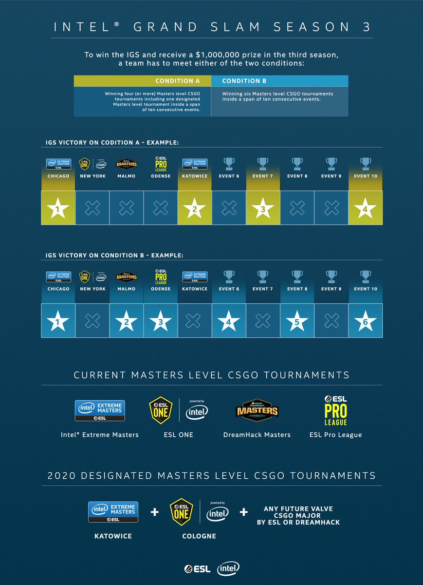 Trong một thông báo vào tối qua thì ESL đã công bố Intel Grand Slam mùa 3 với một số thay đổi theo hướng nâng cao độ khó. Cụ thể thì đội hoàn thành vẫn sẽ nhận được 1,000,000 USD nếu họ vô địch được 4 giải đấu được tổ chức bởi ESL hoặc DreamHack trong khoảng thời gian 10 giải đấu, tuy nhiên trong đó phải có một giải đấu thuộc cấp độ Master (trong năm 2020 các giải đấu thuộc cấp độ này sẽ là IEM Katowice, ESL One Cologne và bất kỳ Major nào được tổ chức bởi các công ty khác). Nếu không hoàn thành được yêu cầu trên thì team sẽ phải vô địch 6 giải đấu để có thể sở hữu cho mình danh hiệu này.