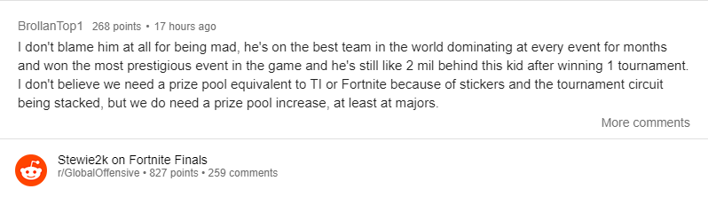 “Tôi không trách anh ấy khi đã nổi cáu, Stewie2k là một phần của team mạnh nhất thế giới, thống trị mọi giải đấu trong nhiều tháng liên tiếp và đạt được các danh hiệu lớn nhất của CS:GO như Major hay Intel Grand Slam nhưng vẫn thua tới 2 triệu đô so với Bugha, sau khi cậu ta chỉ thắng có một giải đấu” – một tài khoản Reddit chia sẻ.