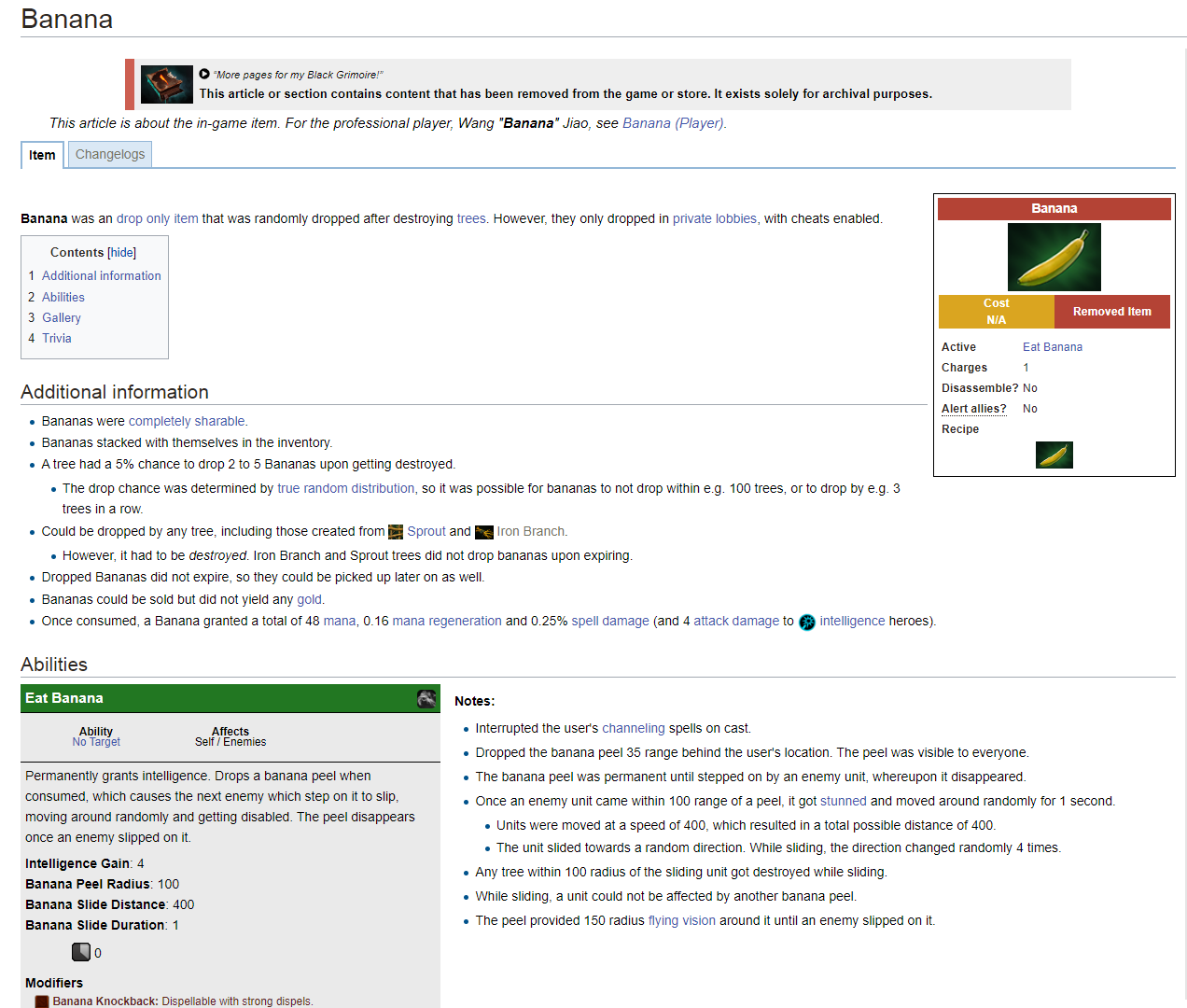 Thay vì bán đi những Trái Chuối 0 đồng, Hero của bạn có thể hấp thụ 1 Charge Banana để bổ sung thêm B6, vitamin C, Kali và đặc biệt là 48 Mana, 0.16 Mana Regen và 0.25% Spell Damage (Hero Intelligence thậm chí còn được +4 Damage). Sau khi ăn xong, những vị chiến binh này sẽ xả vỏ bừa bãi ngay tại nơi mà họ "sực" quả chuối, và những ai không may giẫm phải những chiếc "bẫy" này, kể cả là đồng đội cũng đều sẽ bị trượt chân và bay ra xa khoảng 400 Range trong vòng 1 giày. Ngay cả BKB hùng mạnh chống đủ mọi loại phép thuật hắc ám cũng không thể chống lại sức mạnh của vỏ chuối ...