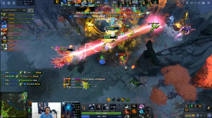 Game 1 có thể nói là màn trình diễn hoàn hảo của 496 Gaming. Dù cho đem đến nhiều lượt pick khá lạ, nhưng chẳng những tỏ ra thất thế, mà ngược lại, Datbb cùng những người đồng đội mới là những người nắm giữ toàn bộ thế trận. Puck - Midlaner siêu hot của meta hiện tại đã hoàn toàn mất điện khi phải đối đầu với Night Stalker của hTz. Tương tự, các lane còn lại cũng chả khá hơn là bao khi mà 496 liên tục chủ động thực hiện những pha roam gank và khiến đối thủ bị cuốn vào lối chơi của họ. Với chất tướng giữa nhiều vào Level và Item, chẳng mấy chốc Vice eSports đã tỏ ra thất thế và nhanh chóng phải chịu thất bại chỉ sau chưa đầy 30 phút thi đấu.