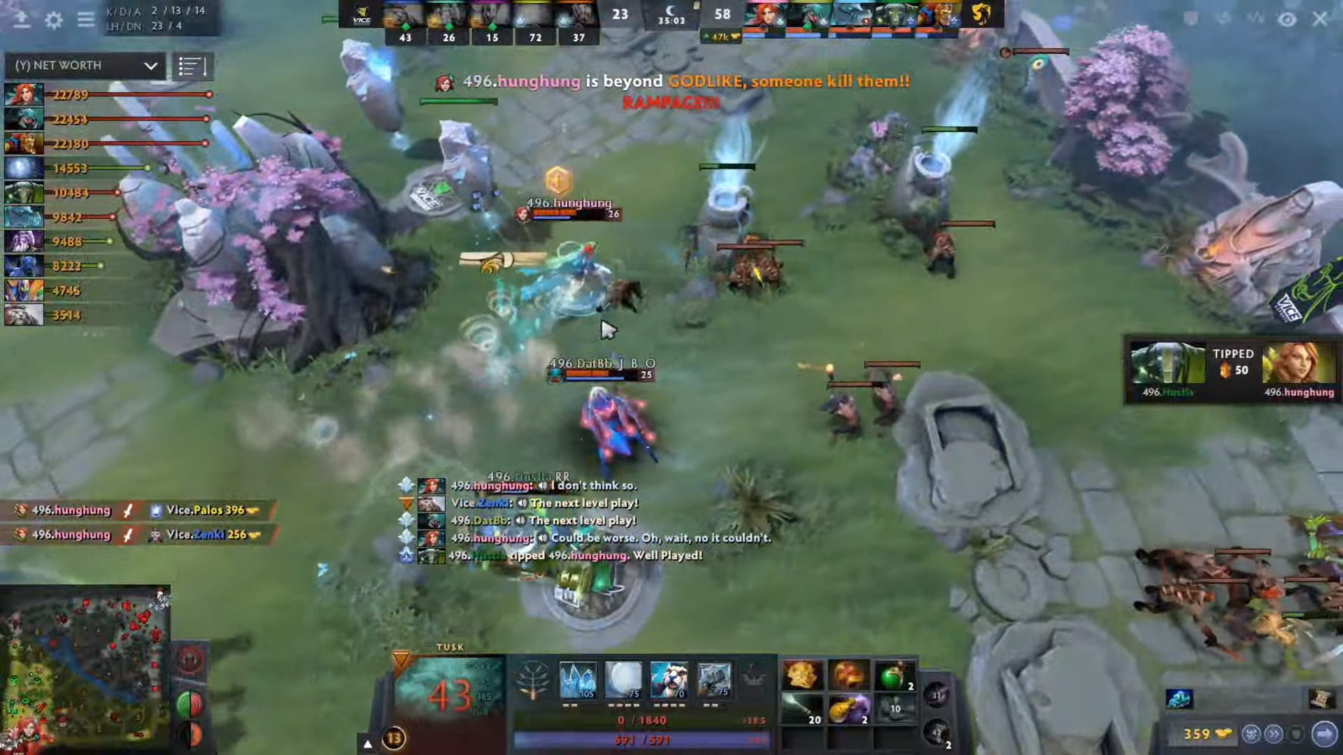 Rút kinh nghiệm từ game đấu thứ nhất, các chàng trai đến từ Philippines lần này là người đã chủ động hơn trong game 2. Họ gây ra tương đối nhiều khó khăn trong giai đoạn Early Game nhờ những Hero có khả năng Snowball tốt như Night Stalker hay Void Spirit. Tuy nhiên, Vice lại mắc quá nhiều sai lầm trong những Combat tổng khi liên tục để cho Winter Wyvern của Bombi và Earth Spirit có những tình huống sử dụng skill trúng đến 4 - 5 thành viên. Với lượng Damage khổng lồ mà bộ đôi Support này gây ra, đại diện của Philippines thua liền 2 pha Combat lớn, đánh mất luôn lợi thế mà họ đã có ở Early Game và thi đấu như gà mắc tóc ở thời điểm sau đó. Thậm chí, Windranger của hTz còn có cho mình một pha Rampage ở thời điểm cuối trận để kết thúc trận ra quân của 496 Gaming theo một cách không thể tuyệt vời hơn.