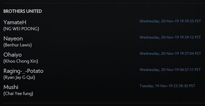 Với việc vòng loại Closed Qualifier của Leipzig Major sẽ diễn ra trong một tuần nữa, trang đăng ký team cho mùa giải DotA Pro Circuit 2019-2020 đang xảy ra rất nhiều biến động, đáng chú ý hơn cả là sự xuất hiện của một stack mới tại khu vực Đông Nam Á, Brothers United. Stack này có sự góp mặt của rất nhiều player “gạo cội”, không chỉ ở SEA mà còn đã tạo được tiếng tăm trên thế giới. Chai “Mushi” Yee Fung, Ng “YamateH” Wei Poong và Khoo “Ohaiyo” Chong Xin có vẻ đã bỏ qua những mâu thuẫn trước đây để sát cánh cùng nhau, và cùng với họ là hai player Philippines tài giỏi khác: Benhur “Benhur” Lewis và Ryan “raging_potato/Bimbo” Jay Qui.