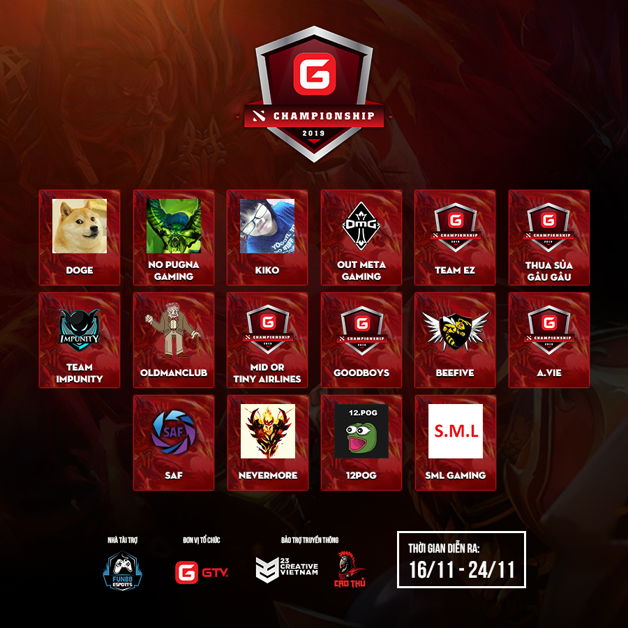 Chỉ sau 2 tuần mở cửa đăng kí, GDC 2019 đã được đón nhận sự hào hứng, nhiệt tình của cộng đồng Dota 2 Việt Nam cùng với đó sự tham gia của rất nhiều các game thủ đến từ những tỉnh thành khác nhau trên khắp đất nước. Sau đây là danh sách 16 đội tuyển Dota 2 sẽ tham chiến tại GTV Dota 2 Championship 2019: