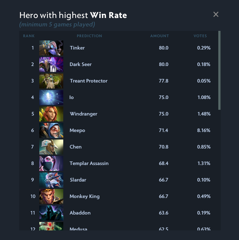 Đây là 3 heros có thể minh chứng cho việc xuất hiện ít nhưng chất lượng. Tinker và Dark Seer được lựa chọn tròn trịa đúng 5 lần, và 4 trong số đó đã đem lại chiến thắng cho đội đã lựa chọn những hero này. Treant Protector cũng góp mặt tới 9 lần tại giải đấu lần này với 7 chiến thắng trong tay, một thành tích khá ấn tượng đối với 1 hero chưa bao giờ là hot boy tại đấu trường chuyên nghiệp như vị Thần Cây.