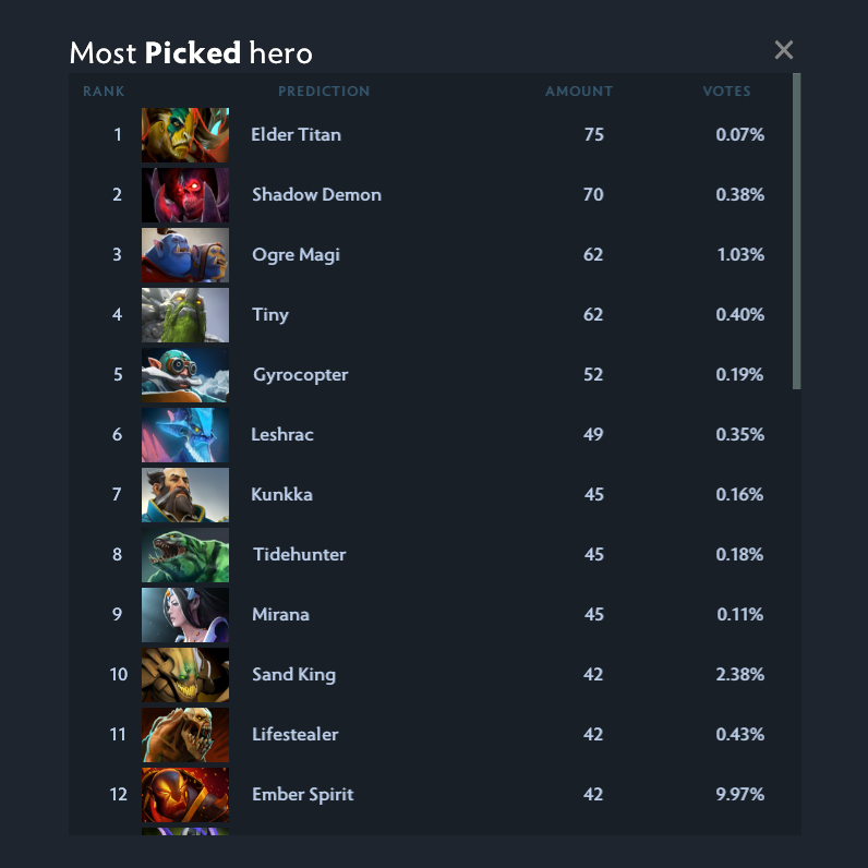Chễm chệ ở 3 vị trí đầu tiên là bộ 3 Support mạnh nhất phiên bản hiện tại Ogre Magi, Shadow Demon và vị thần kiến tạo thế giới Dota 2, Elder Titan. Lí do bộ 3 này xuất hiện tại ví trí hot pick cũng khá dễ hiểu khi Ogre Magi được buff cực nhiều trong những phiên bản trở lại đây, biến chàng Ogre 2 đầu từ một hero bị hắt hủi ngày nào trở thành một trong những pick được ưa chuộng nhất thời điểm hiện tại.