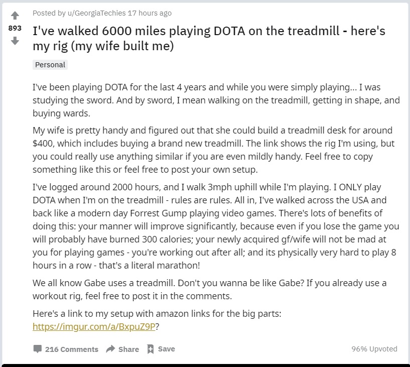 Tôi đã đăng nhập khoảng 2000 giờ và đi bộ 3 dặm/h trên dường dốc trong khi chơi. Tôi CHỈ chơi DOTA khi đang chạy trên máy - luật là luật. Chơi tới bến luôn, tôi đã vừa đi khắp cả nước Mỹ rồi về Forrest Gump thời hiện đại vừa chơi game.