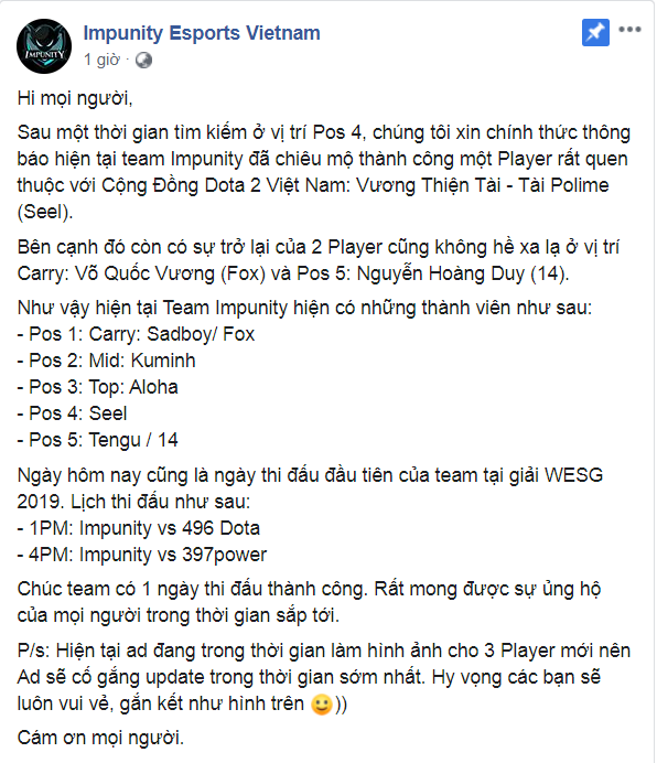 Để một nền Dota 2 của một quốc gia phát triển mạnh mẽ hơn thì cần phải có nhiều hơn những đội tuyển Dota 2 có khao khát, ý chí và cả thực lực để khiến cho vị trí đội mạnh nhất của đất nước luôn luôn nằm trong tình trạng sẵn sàng đổi chủ. Những giải đấu như ESL Vietnam đã tạo ra những cơ hội rất lớn để những nhân tố mới đầy tiềm năng xuất hiện, và một trong số đó đã thành công trong việc khẳng định sức mạnh của bản thân ở đấu trường trong nước, và phần thưởng với họ là sự chú ý của các nhà đầu tư thể thao điện tử. Đó không ai khác là á quân ESL Vietnam mùa 2, Super Saiyan God. Giờ đây, họ đã có một mái nhà mới, một tổ chức Esports với uy tín hàng đầu khu vực - Impunity.