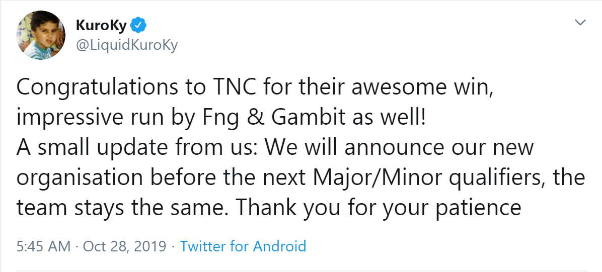 Còn với các cựu thành viên của team Liquid, thông tin về họ từ sau khi họ rời tổ chức này là vô cùng hạn chế, nói chính xác hơn là "bặt vô âm tín" trong suốt khoảng thời gian dài. Cho đến ngày hôm nay, Quốc trưởng Kuroky đã có những thông báo chính thức đầu tiên về đội hình của mình tại mùa giải mới. Cụ thể, đội hình Liquid tham dự TI9 sẽ tiếp tục sát cánh bên nhau tại Dota Pro Circuit 2019 - 2020. Họ sẽ chính thức trở lại vào ngày 1 tháng 12 - ngày diễn ra vòng loại Minor/Major thứ 2.
