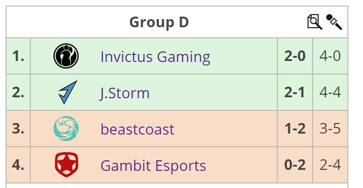 Bảng D bắt đầu ngày thi đấu thứ 2 mà kèo bo3 rất mãn nhãn giữa Gambit Esports và beastcoast. Giành được thắng lợi khá nhọc nhằn ở game 1 nhưng fng và đồng đội không thể khắc chế những lượt pick thuận tay của các chàng trai Nam Mỹ và chấp nhận xuống nhánh thua của vòng playoffs. Đụng độ một đội tuyển Bắc Mỹ cũng đang thể hiện tốt ở vòng bảng là J.Storm, beastcoast tiếp tục thể hiện bản lĩnh khi đánh rất sòng phẳng với J.Storm ở hai game đấu đầu tiên. Sang game đấu thứ 3, beastcoast pick một bài khá dị với Tinker offlane và Omniknight ở vị trí carry đối đầu với combo Chaos Knight - Ogre Magi của J.Storm. Bất chấp việc bị dẫn đến 30 mạng nhưng lượng net worth chênh lệch không quá lớn do Tinker của Wisper dẫn đầu net worth. Với việc Tinker thoải mái xả skill trong combat, đi đẩy lính ở cả 3 lane, J.Storm hoàn toàn bế tắc trong việc lên highground và do đó các core của beastcoast cũng có cơ hội farm bù. Tuy nhiên J.Storm thi đấu rất bình tĩnh và chỉn chu. Chaos Knight trong tay Moo quá khỏe và trong tình huống push mid của Radiant anh đã góp phần lớn tiêu diệt đến 4 thành viên của beastcoast, trong đó không một ai có buyback. Tinker cố gắng spam chiêu để câu thời gian nhưng thân cô thế cô, cuối cùng cũng bị bắt và chết không buyback. beastcoast bất lực nhìn J.Storm phá Ancients và chịu thua chung cuộc 2 - 1.
