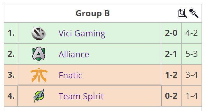 Cục diện bảng B có phần căng thẳng hơn so với bảng A khi trận đấu đầu tiên giữa Fnatic và Team Spirit kéo dài hơn tiếng rưỡi và kết thúc với chiến thắng cho đại diện đến từ Đông Nam Á. Tái ngộ Alliance ở trận đấu cuối cùng, 3 Đá và đồng đội đã chiếm ưu thế trong game 1 đến tận đầu late game nhưng rốt cuộc vẫn không thể chiến thắng Alchemist của Nikobaby. Với Búa Bash 2 trong tay Alchemist, Night Stalker của 23savage dù có BKB cũng bất lực trong combat khi liên tục ăn bash rồi bị LC của 33 Duel. Sau game 1 kéo dài hơn 50 phút, Fnatic dường như đã quá mệt mỏi và “biến hình” thành Fna-toác. Họ nhanh chóng vỡ trận trước đội hình hung hăng và hiếu chiến của Alliance, cuối cùng gõ gg sau gần 30 phút thi đấu.