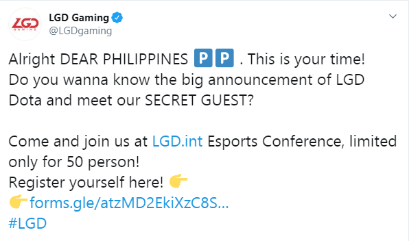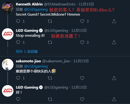 Có thể thấy rằng chữ SECRET GUEST ở đây được viết in hoa toàn bộ nhằm nhấn mạnh và gây sự chú ý với người đọc. Rất nhiều fan hâm mộ cũng đã để ý đến chi tiết này và đã đặt ra những câu hỏi về việc có hay không MidOne đầu quân cho LGD.International? Và đáng ngạc nhiên thay, tài khoản Twitter của LGD Gaming cũng không ngần ngại phản hồi những thắc mắc này một cách rất vui vẻ.