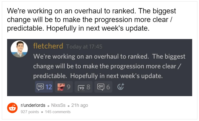 Fletcherd - một nhà phát triển game của Valve - đã thông báo trong kênh Discord của Underlords rằng anh cùng các đồng nghiệp đang có kế hoạch về việc cân nhắc chỉnh sửa hệ thống xếp hạng của game hiện tại. Rõ ràng và dễ đoán định là mục tiêu mà Valve đang hướng tới cho việc chỉnh sửa rank này. Thêm vào đó, họ còn dự định rằng hệ thống rank mới sẽ được ra mắt trong bản update vào tuần tới đây, sau khi mọi việc đã được xem xét kỹ lưỡng.