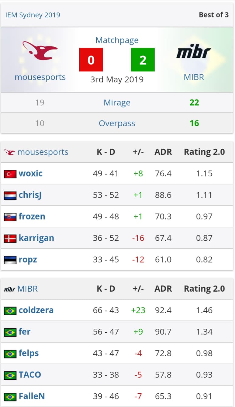 Nhưng nhường đó là không đủ để giúp mousesports có được chiến thắng ở map thi đấu thứ hai, MIBR đã có được chiến thắng trong round halfbuy với 3 kill bằng deagle đến từ vị trí của coldzera và sau đó kết thúc map thi đấu với tỉ số 16-10, ghi tên mình vào trận bán kết của IEM Sydney 2019 trước đối thủ Liquid vào ngày mai.
