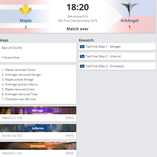 Trận chung kết của giải là cặp đấu giữa đại diện đến từ Thái Lan – Maple và đại diện của Philippines – ArkAngel. Bước vào trận đấu này, hai team chọn cho mình Mirage, Inferno và Overpass là 3 map thi đấu chính thức.