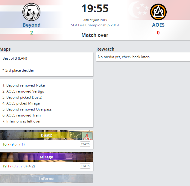 Bước vào trận đấu này, cả Beyond và AOES đều có màn ban pick rất cẩn thận và tôn trọng đối thủ khi lần lượt Nuke và Vertigo đều bị loại bỏ. Ở map thi đấu đầu tiên là Dust2, Beyond đã thể hiện sức mạnh ở map pick của mình khi có một chiến thắng chóng vánh 16-7.