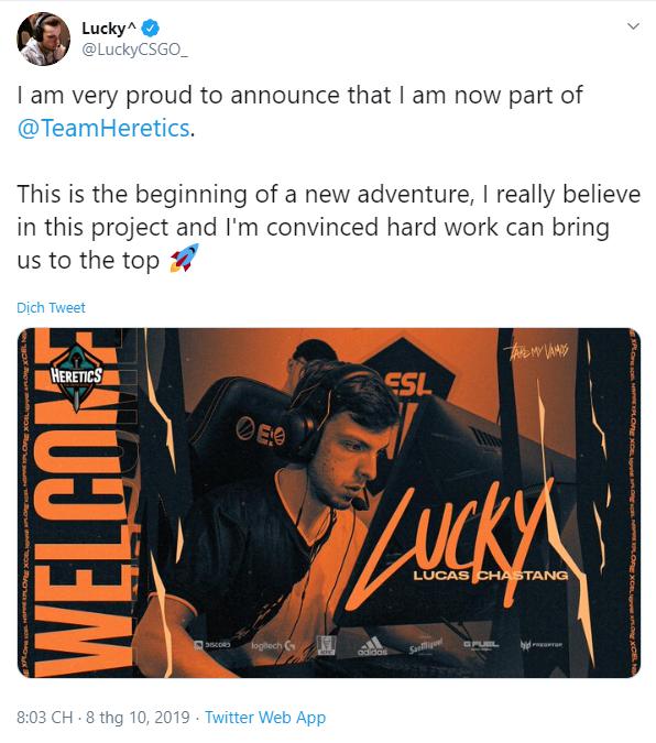 Tại Heretics, Lucky sẽ gặp lại những người đồng đội cũ tại 3DMAX là IGL David “davidp” Prin và AWPer Bryan “Maka” Canda. Ngoài ra thì anh và kioShiMa cũng từng có quãng thời gian ngắn thi đấu cùng với nhau trong màu áo G2 Esports tại ESL One New York vừa qua nên việc làm quen với những người đồng đội có vẻ sẽ không mất nhiều thời gian.