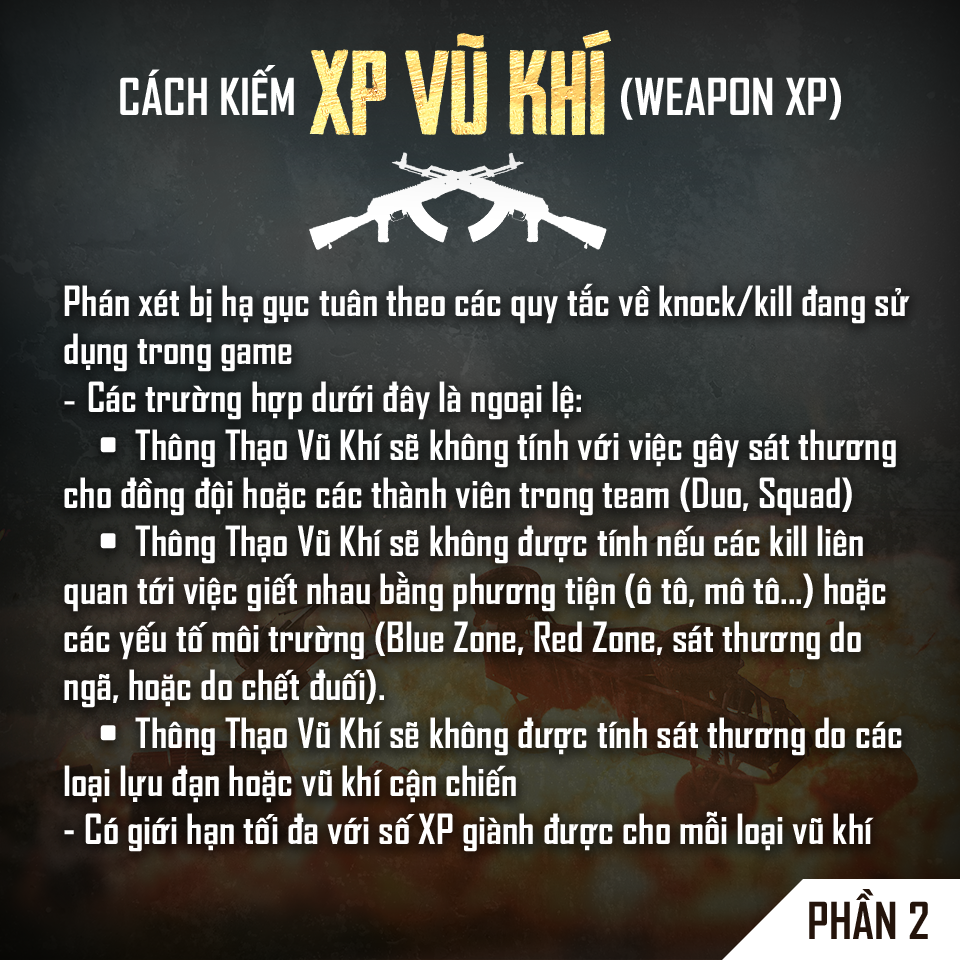 Đây là một hệ thống thăng cấp mới trong PUBG với những phần thưởng độc quyền miễn phí. Thông Thạo Vũ Khí nhắm tới mục tiêu là giúp người chơi cải thiện kỹ năng sử dụng vũ khí và nhận các phần thưởng thú vị trong suốt quá trình này.