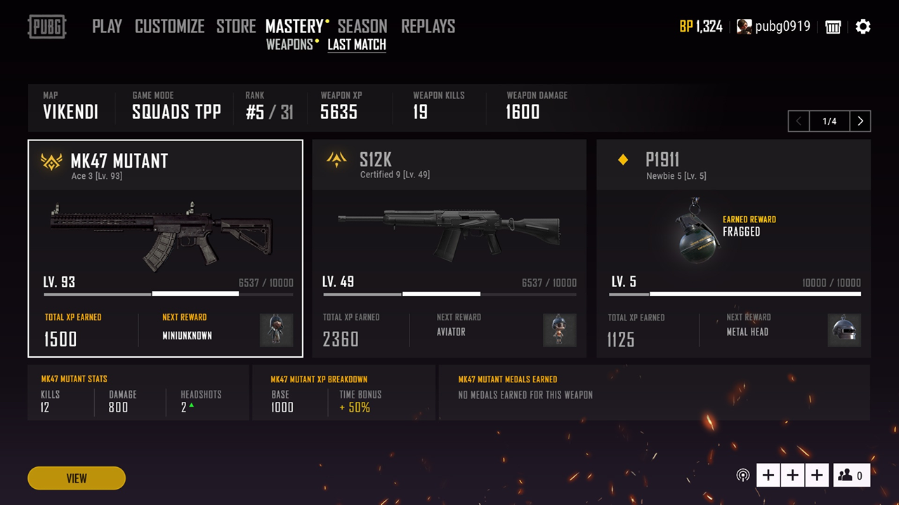 Để giúp người chơi theo dõi tiến trình của mình, NPH đã thêm màn hình trận đấu gần nhất nơi mà bạn có thể xem điểm XP Vũ Khí mà bạn kiếm được, thông số vũ khí, và những phần thưởng đã kiếm được từ trận đấu mà bạn vừa chơi.