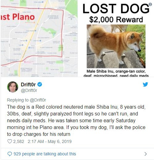 Khỏi phải nói thì ai cũng biết Drift0r yêu chú chó của mình tới mức nào. Vậy nên, cũng dễ hiểu khi anh chàng cực kỳ đau khổ và gần như không thể kiểm soát khi mất chó, đồng thời tìm mọi cách để có thể gặp lại Bumi. Drift0r đã trao phần thưởng tiền mặt trị giá lên tới 2.000$, tương đương khoảng 50 triệu đồng cho bất kỳ ai có thể tìm thấy Bumi, hoặc chỉ ra được nó đang ở đâu hay chí ít là cung cấp các thông tin cần thiết cho công việc tìm kiếm. Bất cứ ai sống ở khu vực East Plano, Texas - nơi mà Drift0r đang sinh sống đều có thể liên lạc với anh chàng qua điện thoại hoặc email nếu có bất kỳ thông tin gì hỗ trợ được anh trong công cuộc tìm kiếm chú chó Bumi. Khá cẩn thận, anh chàng còn yêu cầu các fan làm ơn đừng chơi khăm một người đang đau khổ như mình sau khi tiết lộ công khai số điện thoại liên lạc. Ngoài tiền mặt, Drift0r còn kêu gọi ai lấy chó hãy trả lại cho anh và anh sẽ yêu cầu cảnh sát không truy cứu vụ việc.