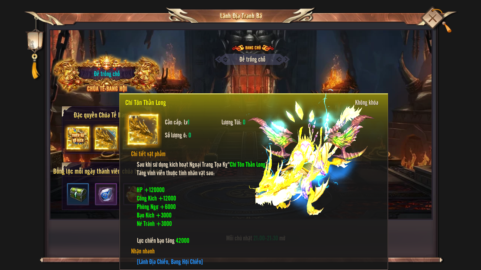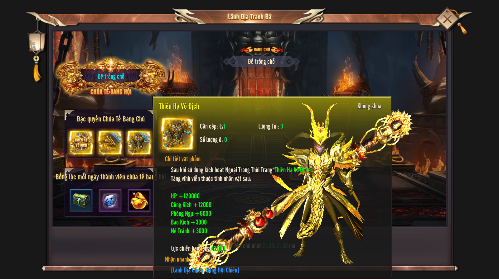 Lãnh Địa Bá Chủ chính là phần thưởng giành cho bang hội xếp hạng TOP 1 trong hoạt động lãnh địa chiến của server trong tuần. Hàng tuần các bang hội mạnh nhất máy chủ sẽ nhận thêm những phần thưởng mới. Phần thưởng lớn tương xứng với công sức bỏ ra, hàng loạt các danh hiệu như “Thiên Hạ Vô Song” hay bộ giáp thời trang cùng thú cưỡi vô cùng hấp dẫn.
