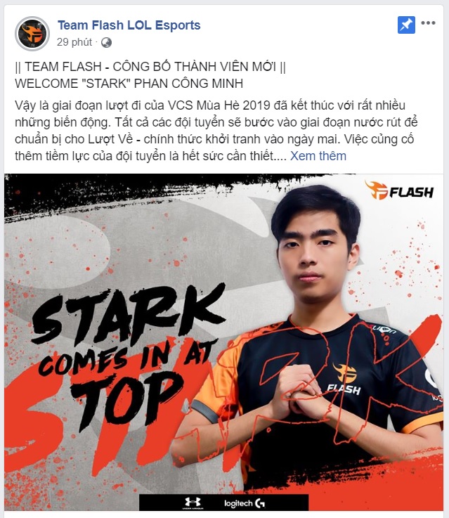 Sau một thời gian dài đàm phán, Team Flash đã thành công ký kết hợp đồng với tuyển thủ "Stark" Phan Công Minh - một người chơi đường trên có khá nhiều kinh nghiệm tại đấu trường VCS cũng như quốc tế.