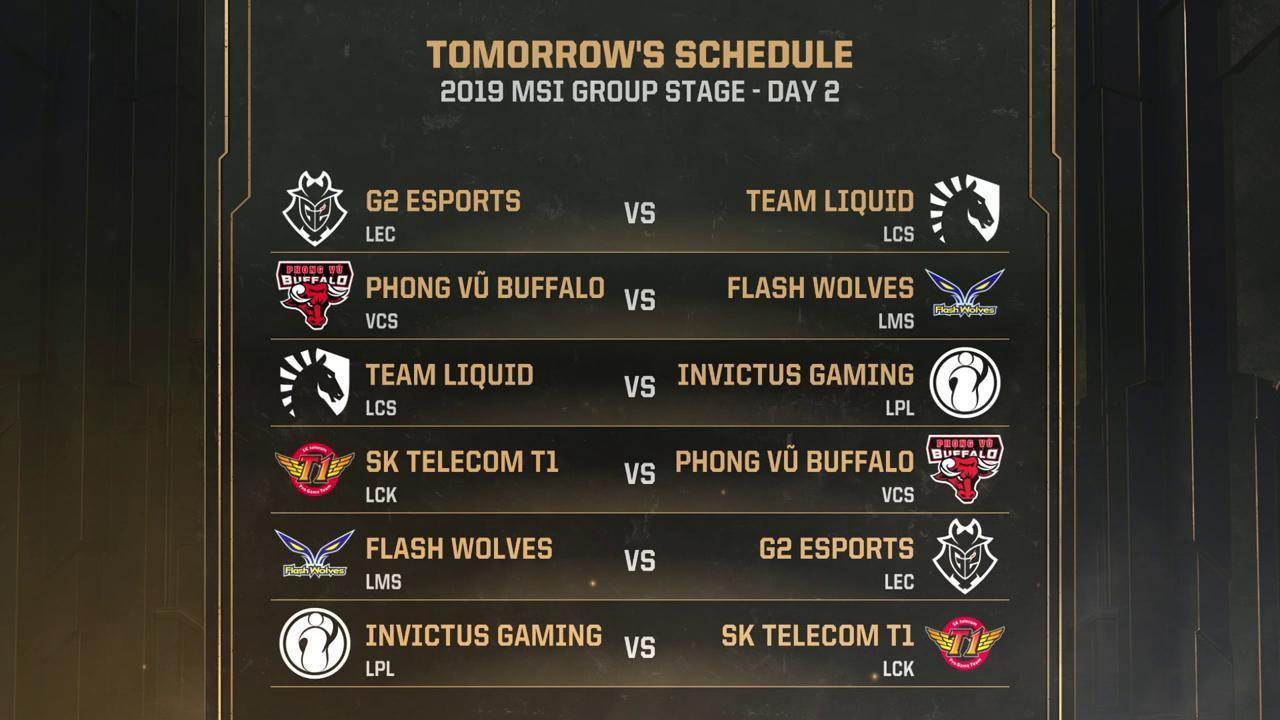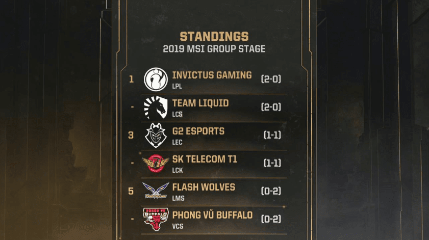 Trải qua ngày thi đấu đầu tiên của vòng bảng MSI 2019, Trung Quốc và Bắc Mĩ là 2 cái tên dẫn đầu trên bảng xếp hạng. Invictus Gaming và Team Liquid đánh dấu kỉ lục bất bại của mình trong ngày thi đấu mở màn và có cho mình mỗi đội 2 chiến thắng.