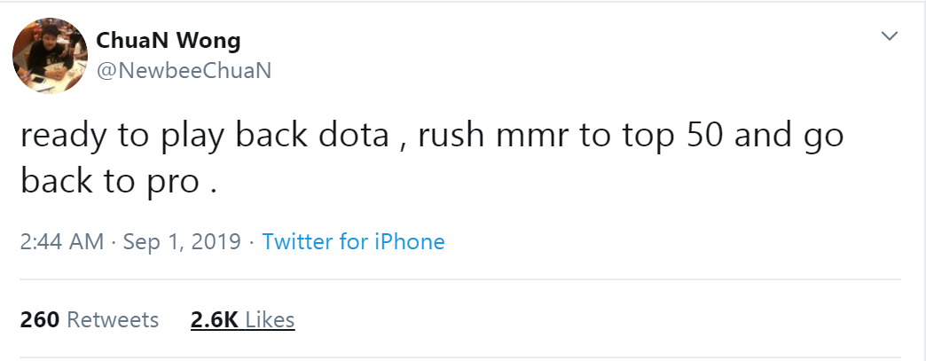 Hơn 1 năm sau, ngày 1 tháng 9 năm 2019, ChuaN bỗng đăng dòng trạng thái của mình trên Twitter bày tỏ mong muốn comeback đấu trường Dota 2 chuyên nghiệp. Vì vậy, nếu MidOne thật sự muốn trở về quê hương Malaysia để lập team thì nhà vô địch TI2 sẽ là một lựa chọn vô cùng hợp lý ở vị trí Hard Support.