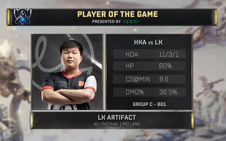 LK đã có màn ra mắt CKTG 2019 không đúng như kỳ vọng khi để thua MEGA ở game đấu đầu tiên. Nhưng sau đó, với đầu tàu Artifact, LK đã lột xác ngoạn mục ở trận đấu thứ 2 trước đại diện LMS Hongkong Attitude. Kết quả 1-1 không phải quá tệ, và những gì Artifact thể hiện là vừa đủ để giúp anh trở thành MVP trong ngày thi đấu thứ 2 vòng khởi động CKTG 2019, nhất là khi Tristana của anh khiến người hâm mộ như phát điên với hàng tá pha xử lý khủng khiếp.