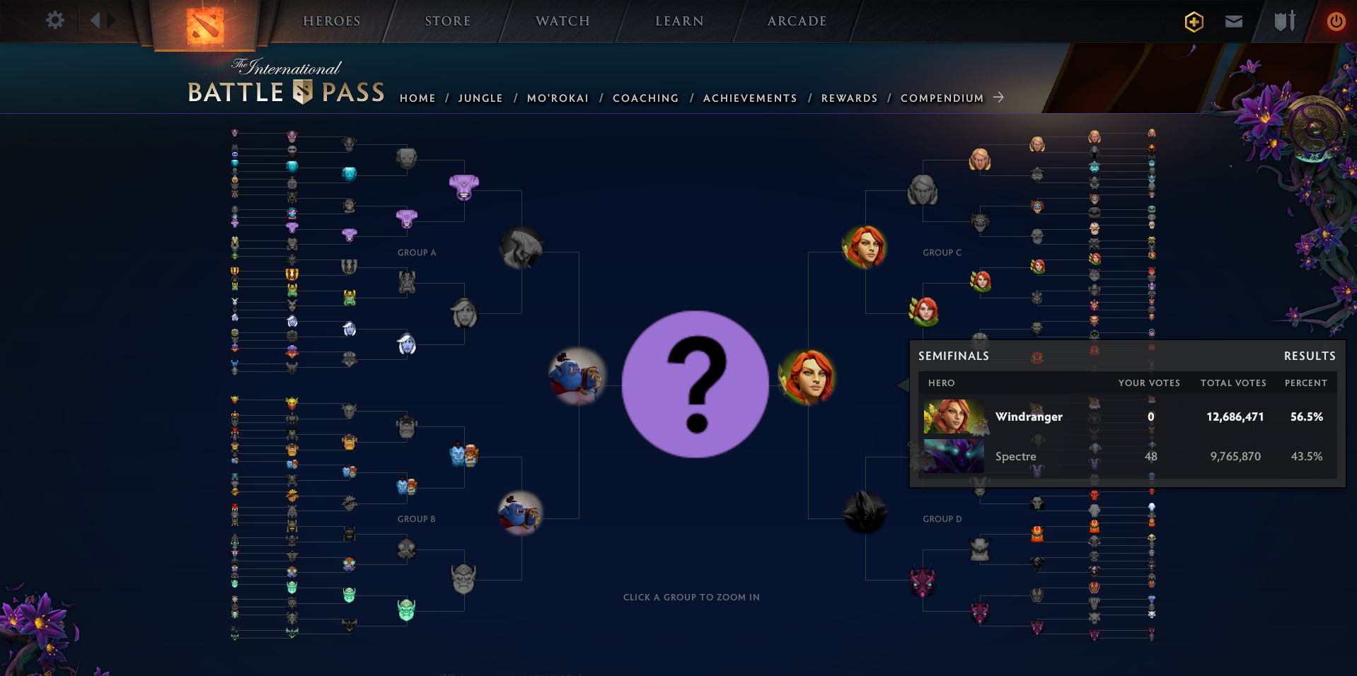 Nhưng một lần nữa thần may mắn đã không mỉm cười với Spectre. Windranger với sức hút kì lạ đã là người giành chiến thắng ở cặp đấu này với cách biệt 3 triệu phiếu. Tạm biệt Spectre và chúc cô may mắn ở Arcana Vote TI10.