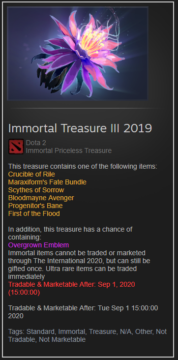 Chỉ còn 1 tuần nữa The International 9 sẽ khởi tranh nhưng thật lạ lùng khi năm nay, tiến độ cho ra mắt vật phẩm mới dành cho Battle Pass của Valve diễn ra khá chậm chạp. Đến thời điểm hiện tại, vẫn còn 3 vật phẩm chưa được ra mắt bao gồm: Immortal Treasure 3, Immortal giới hạn của Tiny và model mới của creep.