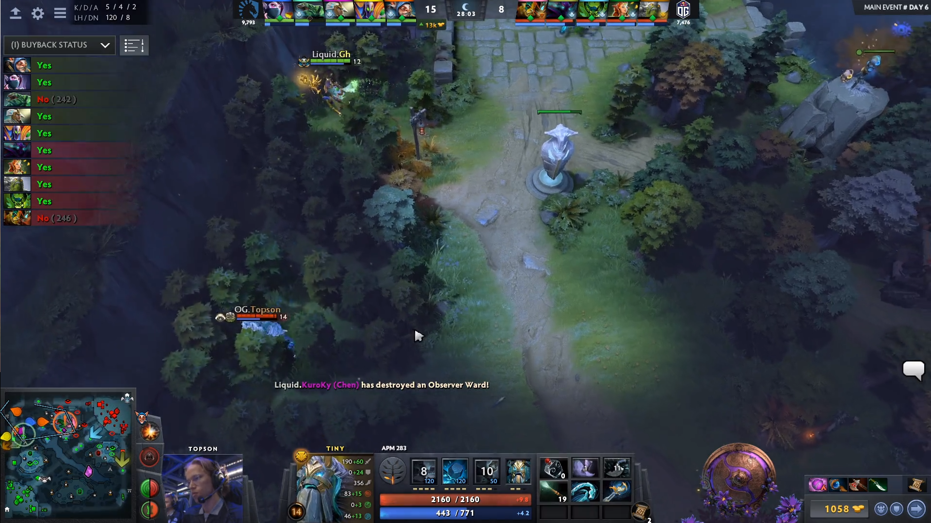 Và cũng từ đây, trận đấu mới diễn biến theo một chiều hướng mà không ai có thể đoán định được. Sai lầm ana mắc phải khi cố gắng lấy đi lane top của đối phương đã khiến OG phải trả giá bằng một combat thua cuộc. Những tưởng trận đấu sẽ phải kéo dài thêm một ít lâu khi team Liquid đang vùng vẫy mạnh mẽ thì không, nhà vô địch TI7 vùng lên quyết tử với pha đẩy thẳng vào nhà chính. Ana dù có cho mình buyback nhưng sự chần chừ đã khiến anh phải trả giá vì sức push của đội hình bên Liquid đã phá tan nhà chính trong chớp mặt. 1 - 0 cho team Liquid.
