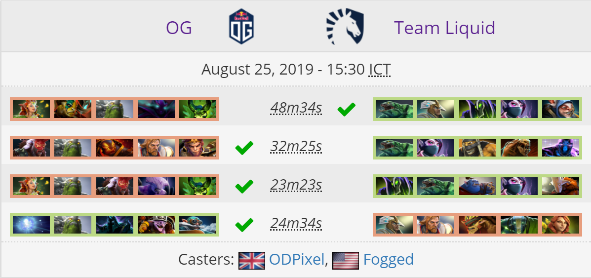Sau game đấu đầu tiên đầy cảm xúc và bất ngờ, thì 3 game đấu sau lại là màn dạo chơi của team OG. Họ đã chứng minh cho chúng ta thấy họ không có đối thủ vào thời điểm hiện tại với việc "bón hành" cho nhà vô địch TI7 3 game đấu liên tiếp. 32 phút, 23 phút và 22 phút là thời gian lần lượt để OG đả bại team Liquid trong game đấu thứ 2, 3 và 4.