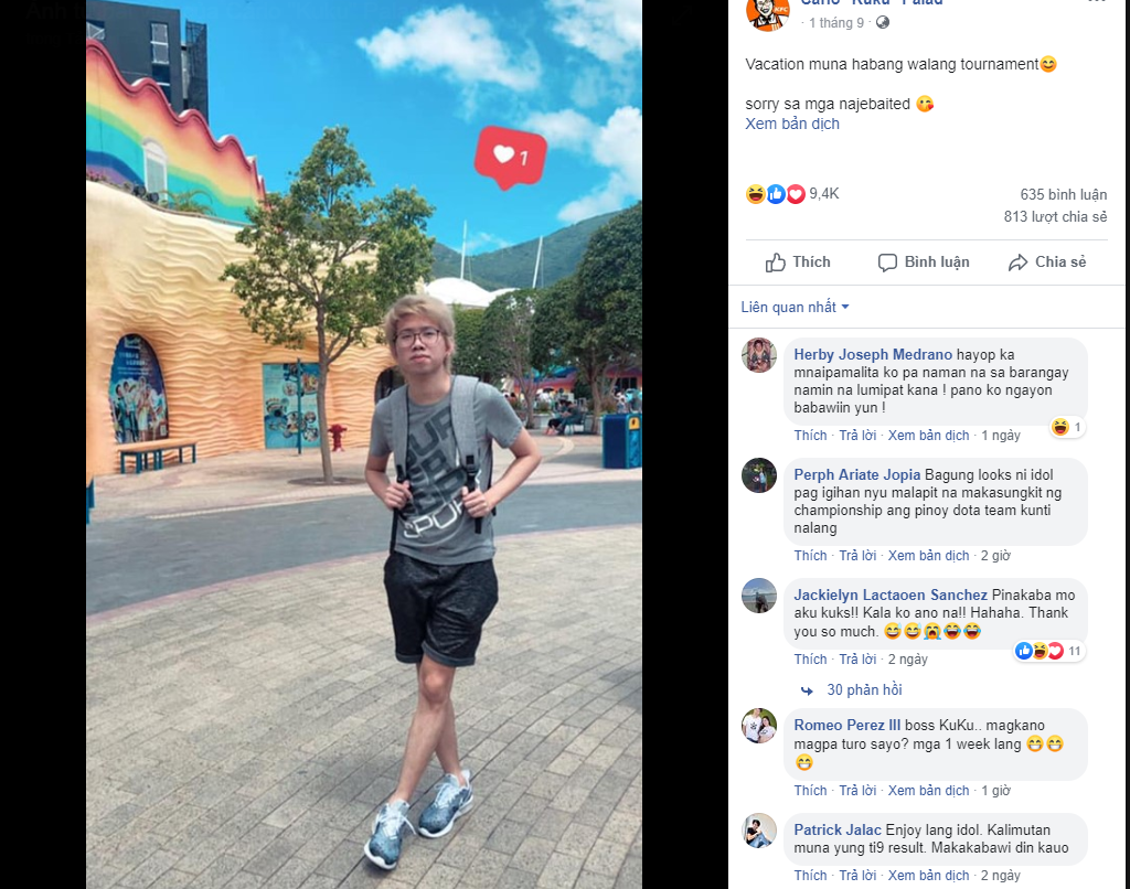 ...để nghỉ mát. Đó là những gì offlaner người Phillippines đang thi đấu dưới màu áo của TNC Predator, Kuku đăng tải trên Facebook cá nhân của mình.
