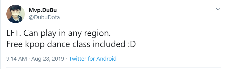 LFT được hiểu đơn giản nghĩa là Left hay còn là rời đi. Đây thường là một dòng trạng thái ngắn gọn của những game thủ Dota 2 nhằm bày tỏ rằng họ đã không còn thi đấu dưới màu áo của đội tuyển mà họ đang phục vụ gần nhất. Ví dụ như Dubu cũng đăng tải một Tweet tương tự và mặc dù chưa có thông báo chính thức từ phía đội chủ quản của player người Hàn Quốc nhưng có thể hiểu là Dubu đã dứt áo ra đi.