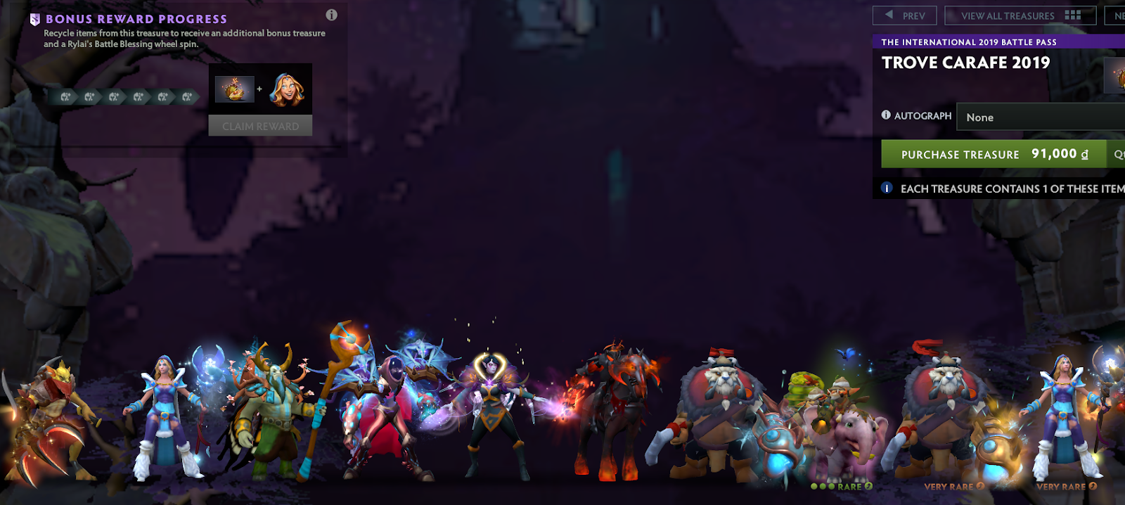 Đây có thể nói là phiên bản hòm Immortal hoàn hảo nhất của Valve khi đa số những Immortal xuất hiện trong hòm này đều thuộc vào hàng cực phẩm, với thiết kế tạo hình cực chất và thay đổi kĩ năng cực ngầu. Chắc hẳn vẫn còn nhiều người còn nhớ chú Hổ có cánh của Mirana, Ultra Rare của hòm Trove Carafe 2018 nhìn ngầu như thế nào phải không? Và một lần nữa, Valve đã không làm chúng ta thất vọng với Trove Carafe 2019.
