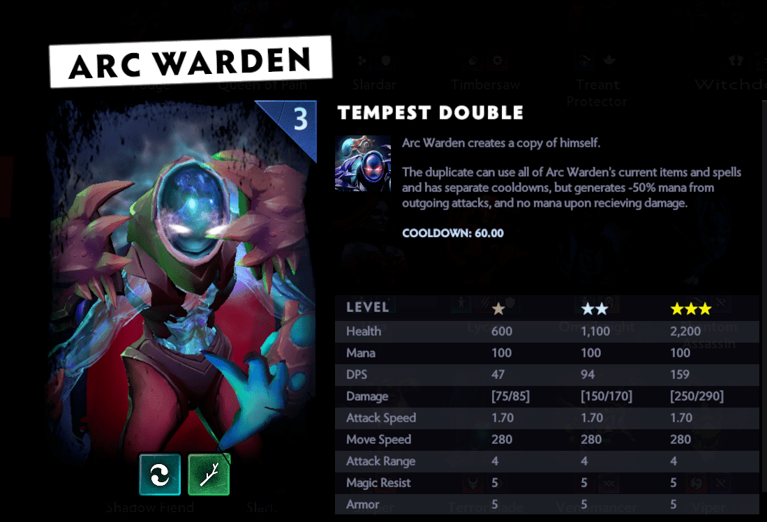 Đánh giá: Bên cạnh việc Arc Warden có khả năng phân thân thành 2 unit và gây ra rất nhiều sát thương, hắn còn có khả năng "phế" đối thủ như cách mà Shadow Shaman hay Disruptor vẫn làm. Tuy nhiên, vì là tướng 1 sao nên Arc Warden không hẳn là sự lựa chọn tối ưu bởi lẽ hắn có thể chết trước khi phân thân rồi!