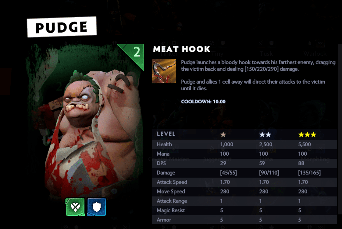 Đánh giá: Pudge có rất nhiều máu và có thể trở thành một Tanker chính hiệu. Là một Warrior, hắn đồng thời có thêm giáp đến từ hiệu ứng của Warrior. Pudge sẽ cực kì có ích khi gặp các đội hình Hunter, bởi lẽ khi ấy hắn sẽ kéo các tướng như Snipers hoặc Drow Rangers của đối phương - những tướng luôn luôn đứng ở góc bàn cờ.