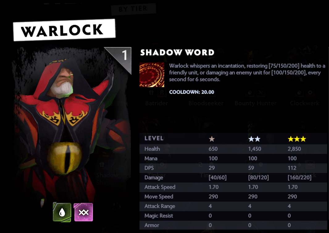 Đánh giá: Đây là một tướng khỏe đầu game, đặc biệt khi ghép cặp với Ogre Magi. Warlock sẽ tăng đồng thời cả khả năng tấn công lẫn phòng thủ với chiêu Shadow Word, như trong Dota 2.