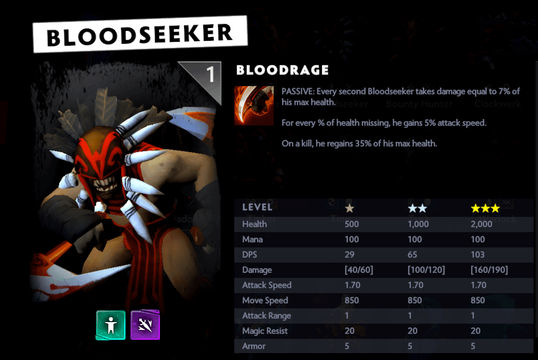 Bloodseeker trong Dota Underlords mang một chút vẻ tương đồng với Huskar trong Dota 2. Hắn dùng máu để tăng tốc đánh với chiêu thức Bloodrage. Giết người giúp hắn sống sót, nhưng nếu dính phải bất kì một loại hiệu ứng disable hoặc cấm đánh nào, Bloodseeker sẽ trở nên vô hại.