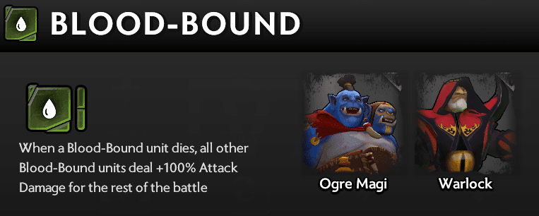 Blood-bound là một tộc mới trong Dota Underlords và đây là một điều vô cùng thú vị bởi lẽ: khi có một unit thuộc Blood-bound chết, tất cả các unit khác thuộc Blood-bound sẽ nhận thêm 100% sát thương trong khoảng thời gian còn lại của trận đấu.