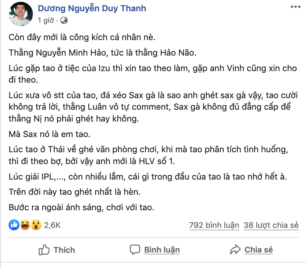 Sự việc bắt đầu nghiêm trọng hơn khi HLV Tinikun trong dòng trạng thái mới nhất chỉ trích thẳng vào HLV Minh Hảo của LK về những thứ đã qua trong quá khứ. Nguyên văn status này như sau: