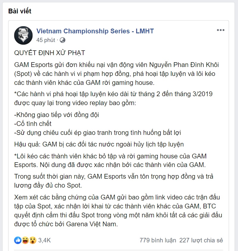 GAM Esports gửi đơn khiếu nại vận động viên Nguyễn Phan Đình Khôi (Spot) về các hành vi vi phạm hợp đồng, phá hoại tập luyện và lôi kéo các thành viên khác của GAM rời gaming house.