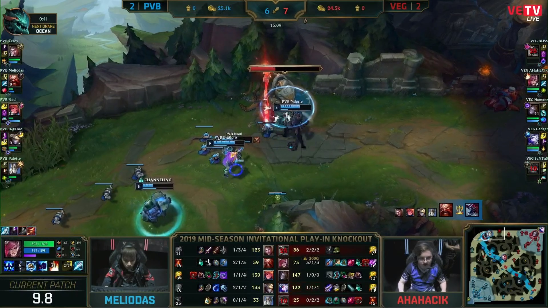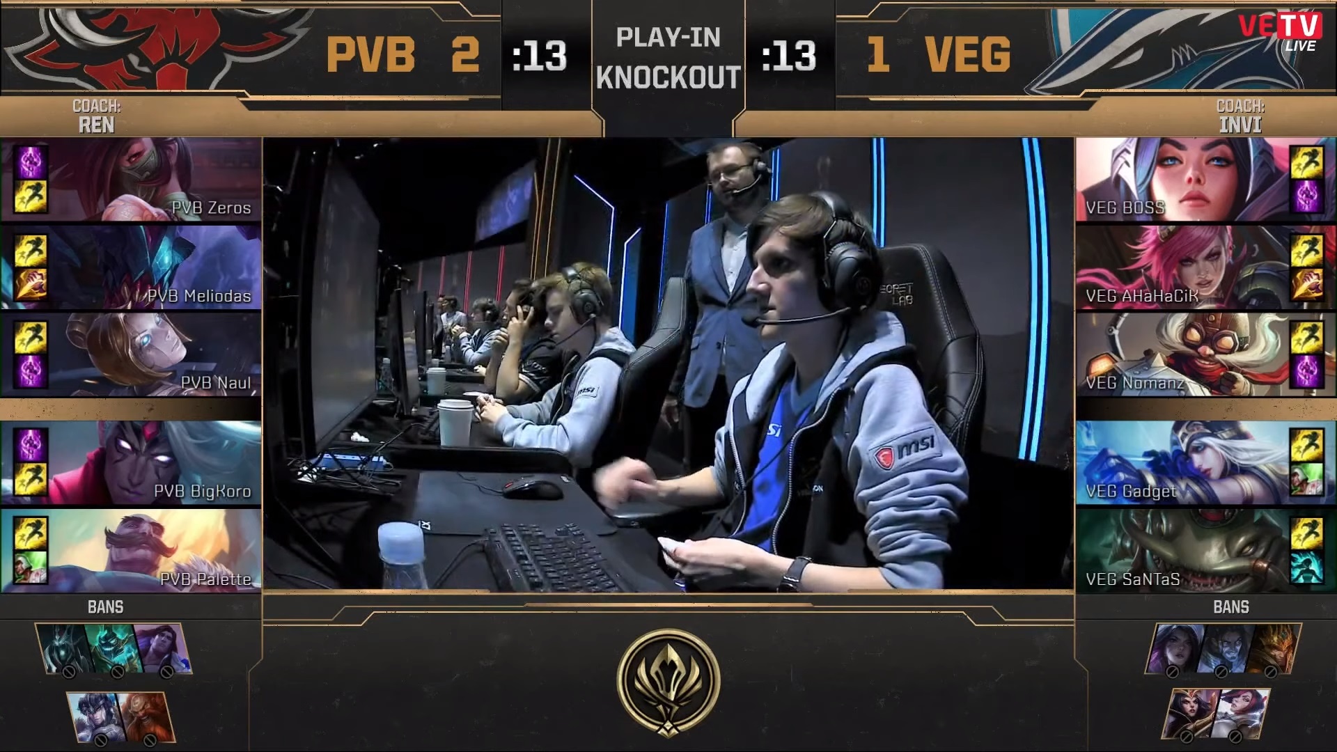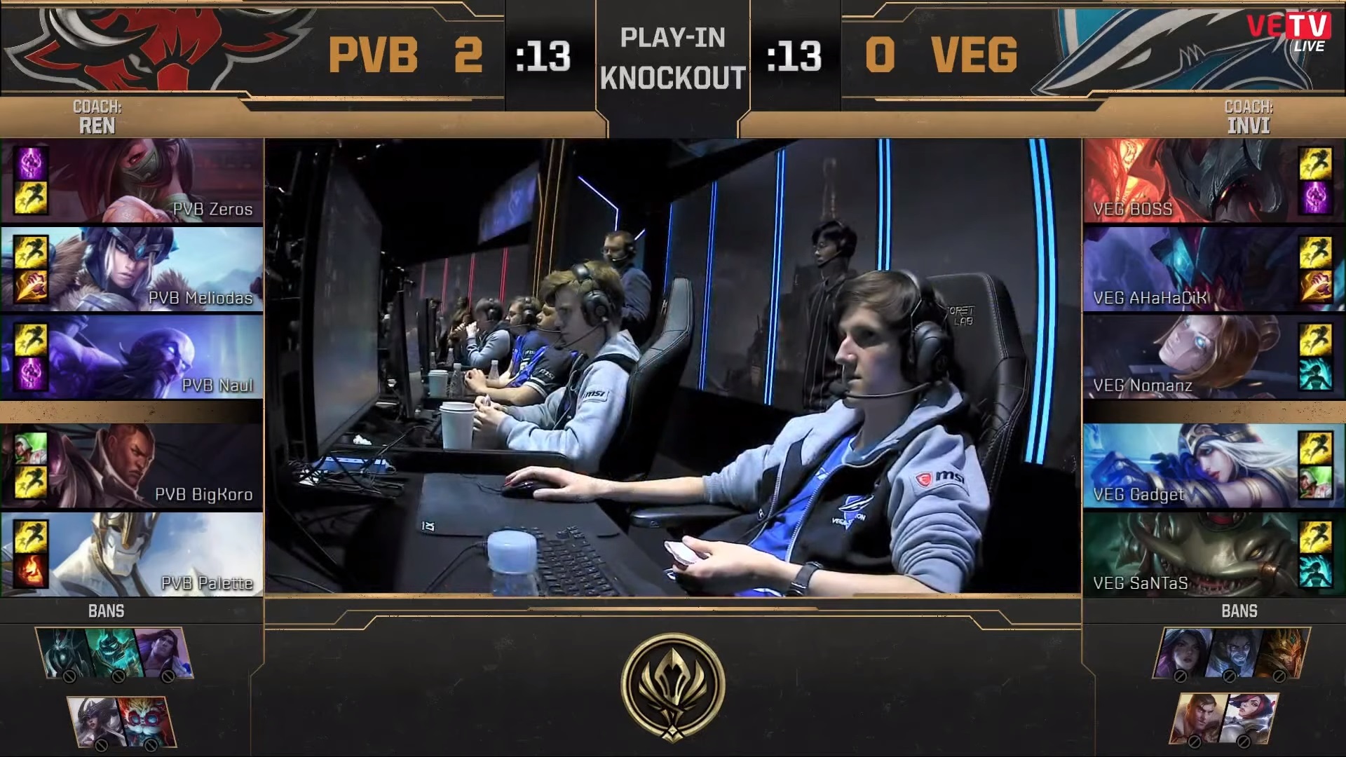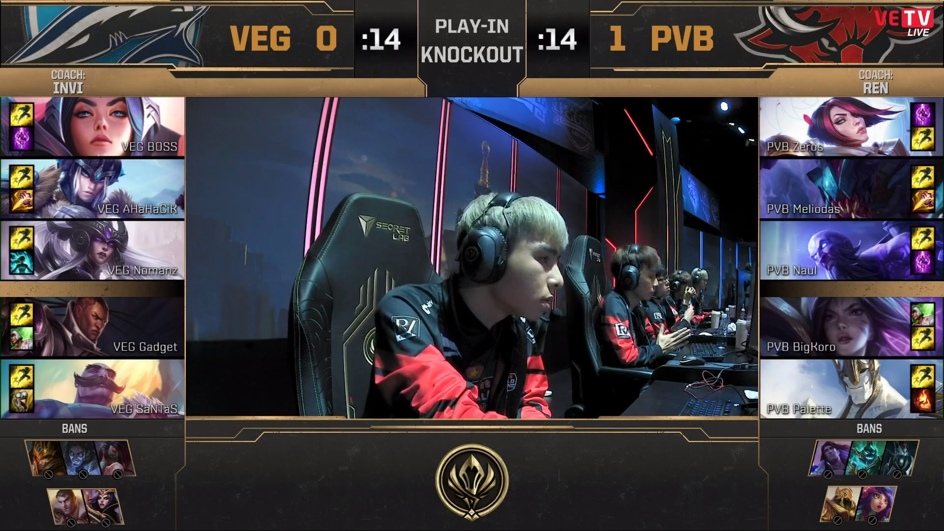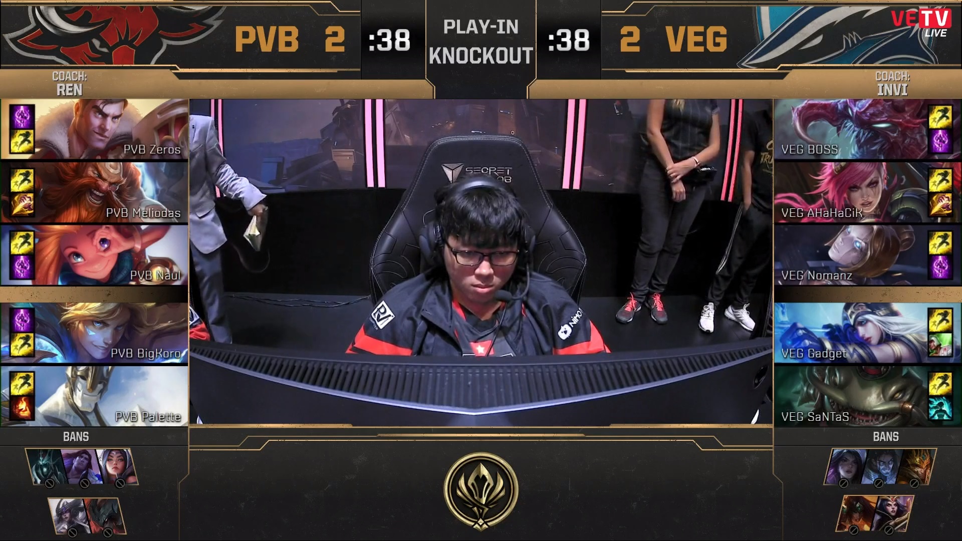 Tại game đấu bắt buộc phải thắng, VEG quyết định chơi tất tay khi tin tưởng Gadget và cho cầm Ashe, BOSS cầm Aatrox và Rek’Sai đi rừng. Bên phía PVB, họ muốn chơi kiểm soát khi lấy Sejuani đi rừng và thả Akali cho Zeros.
